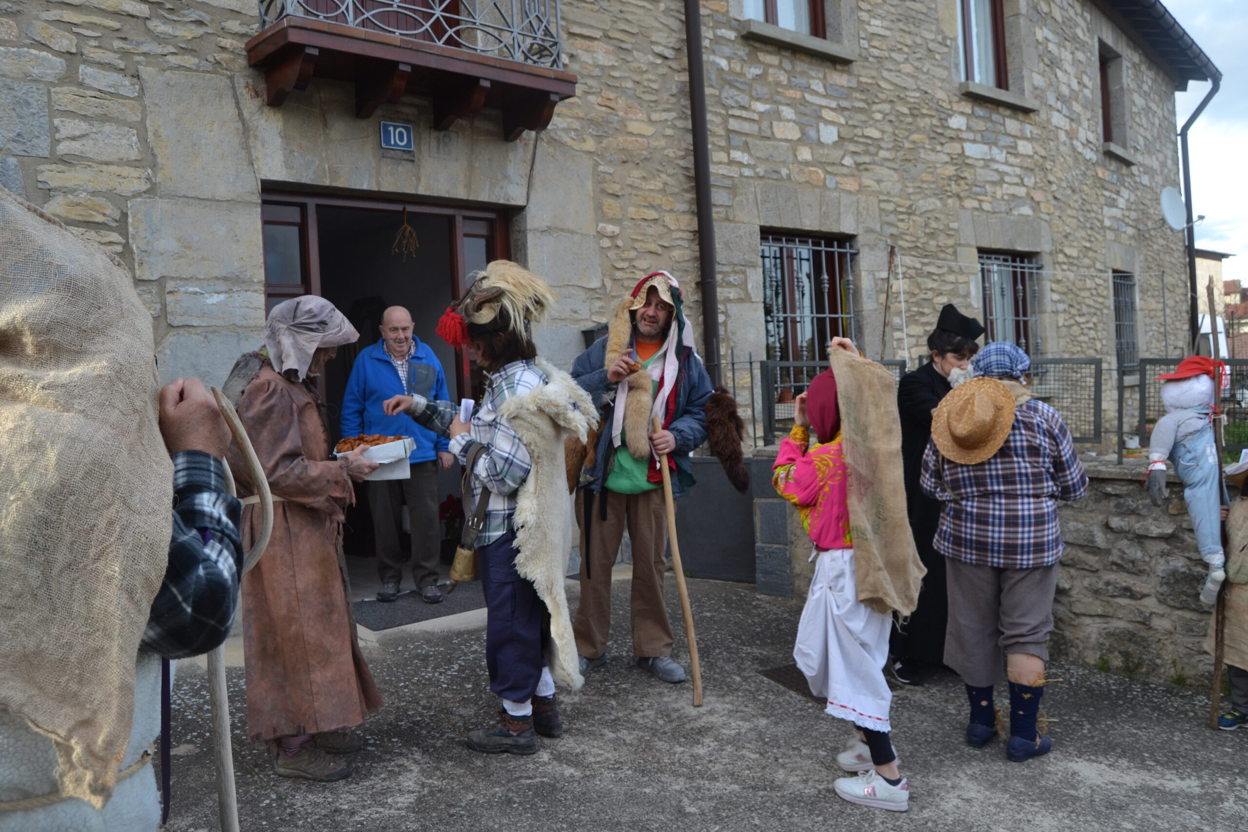 La fiesta se inicia con el toque del cuerno, comenzando a dar golpes en la puerta y vociferando, recorriendo las calles del pueblo amenizados por la txaranga. Los dueños nos obsequian con dulces típicos de Carnaval. En la primera casa y en la plaza incluimos unas danzas. Finalizamos en la plaza donde El Alma del Carnaval, explica el sentido del rito del mismo y entabla conversación con cada uno de los personajes que nos cuentan cuál es su cometido dentro la fiesta.